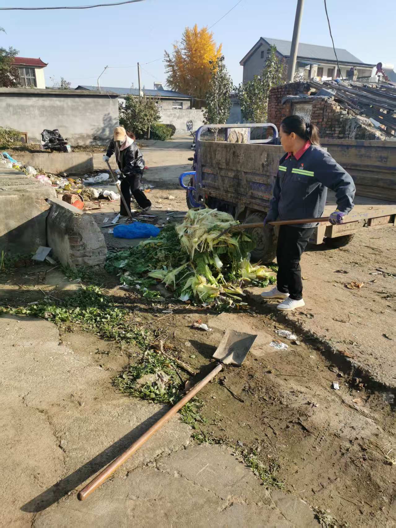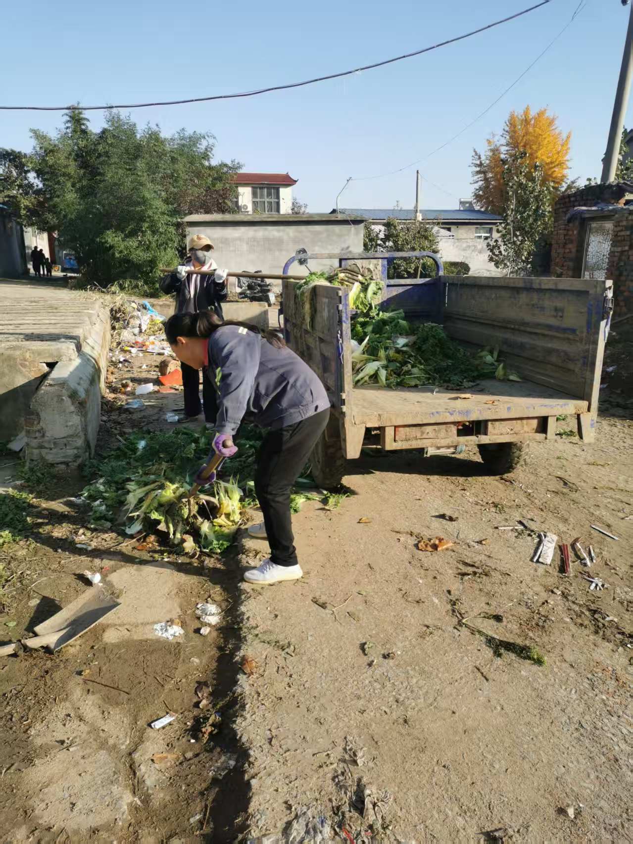 山东省,济宁市,兖州区,新兖镇宋家村村两委会组织志愿者开展服务活动,对村庄沿街大街小巷进行清理垃圾。