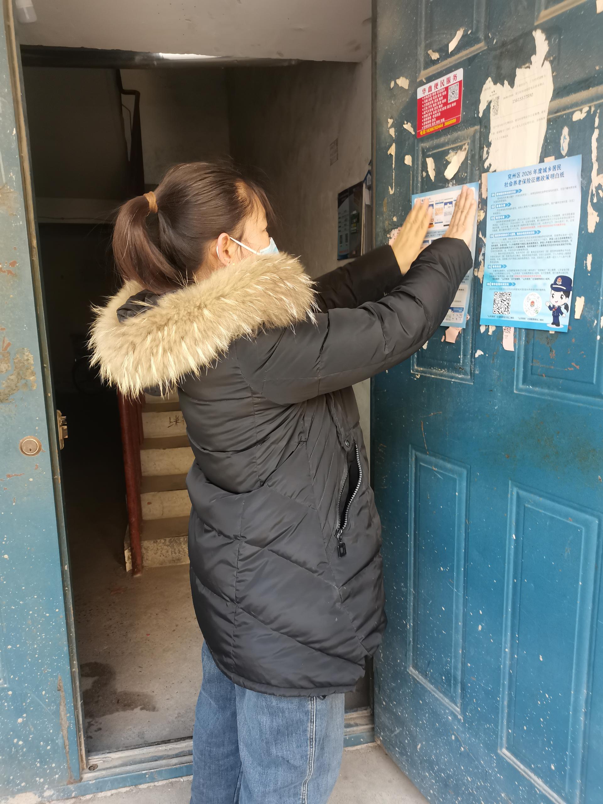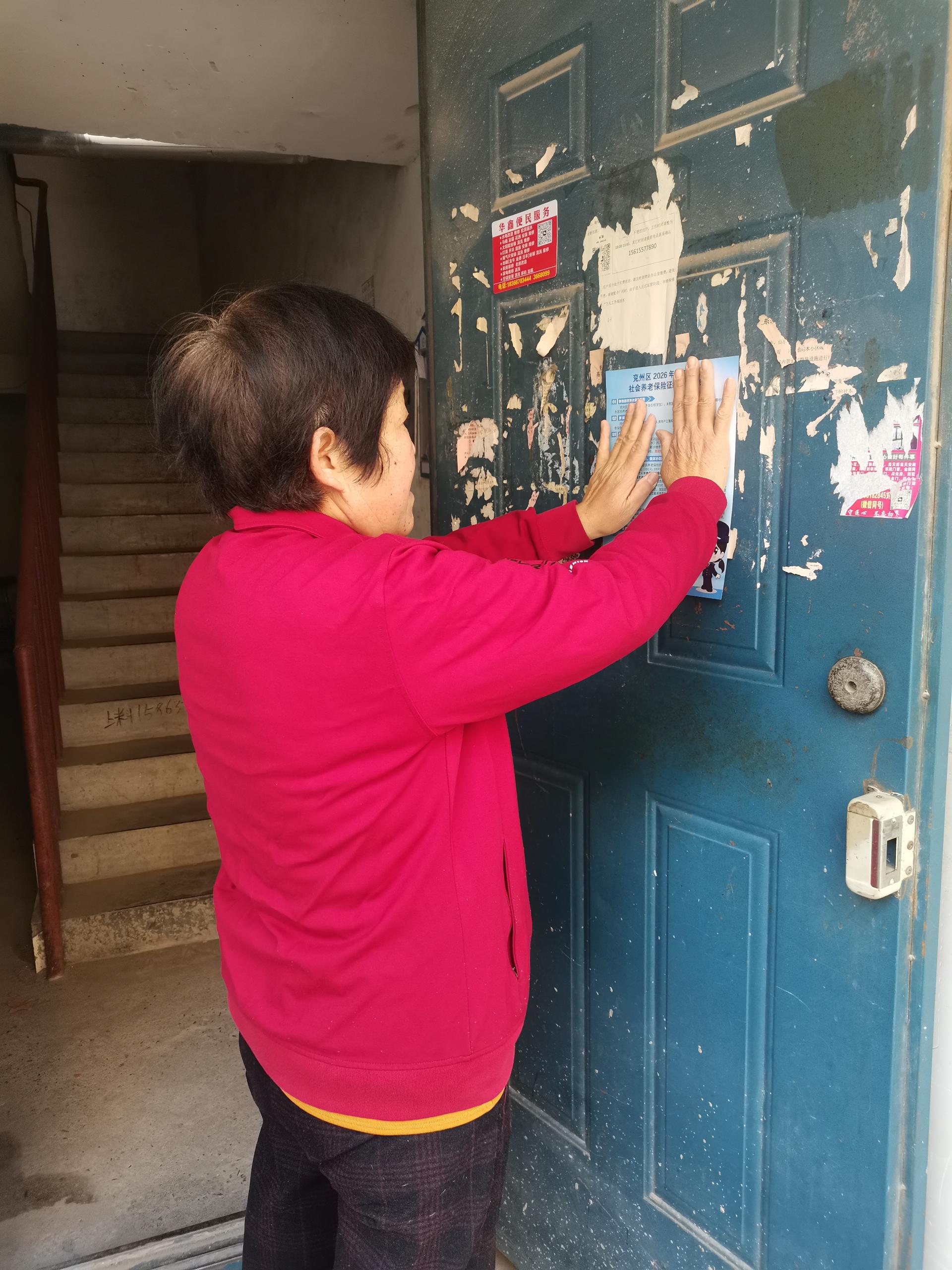 新兖镇牛楼村发放社会养老保险征缴明白纸,公益岗和志愿者们张贴宣传单单页,并发放和讲解保险内容的好处。