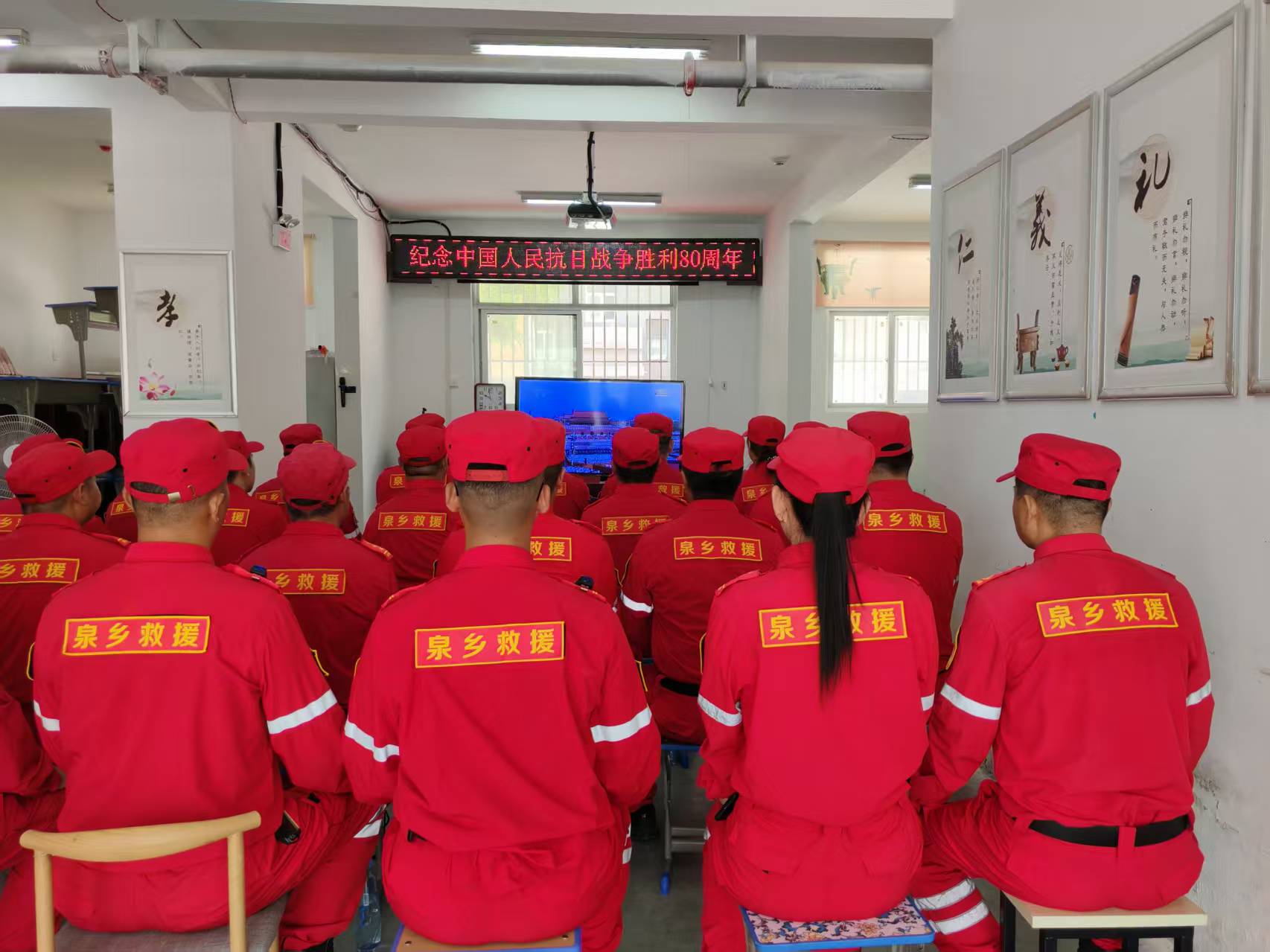 为缅怀先烈、铭记历史,纪念中国人民抗日战争胜利80周年,9月3日上午10时,泗水县红十字泉乡应急救援队联合泉乡义工协会组织泉福社区居民,高龄老兵在泉福社区泉乡义工协会大讲堂开展升国旗仪式及观看纪念抗日战争胜利80周年阅兵仪式。
