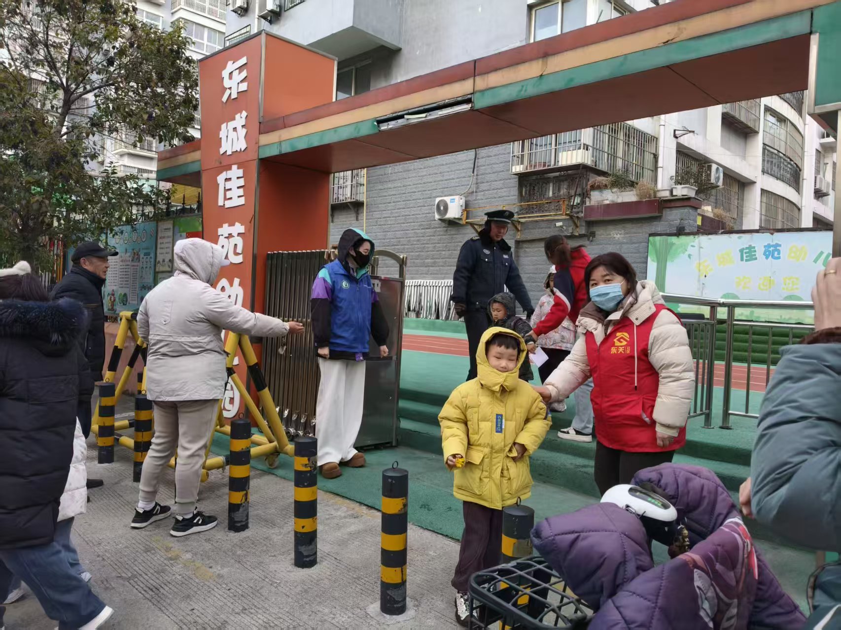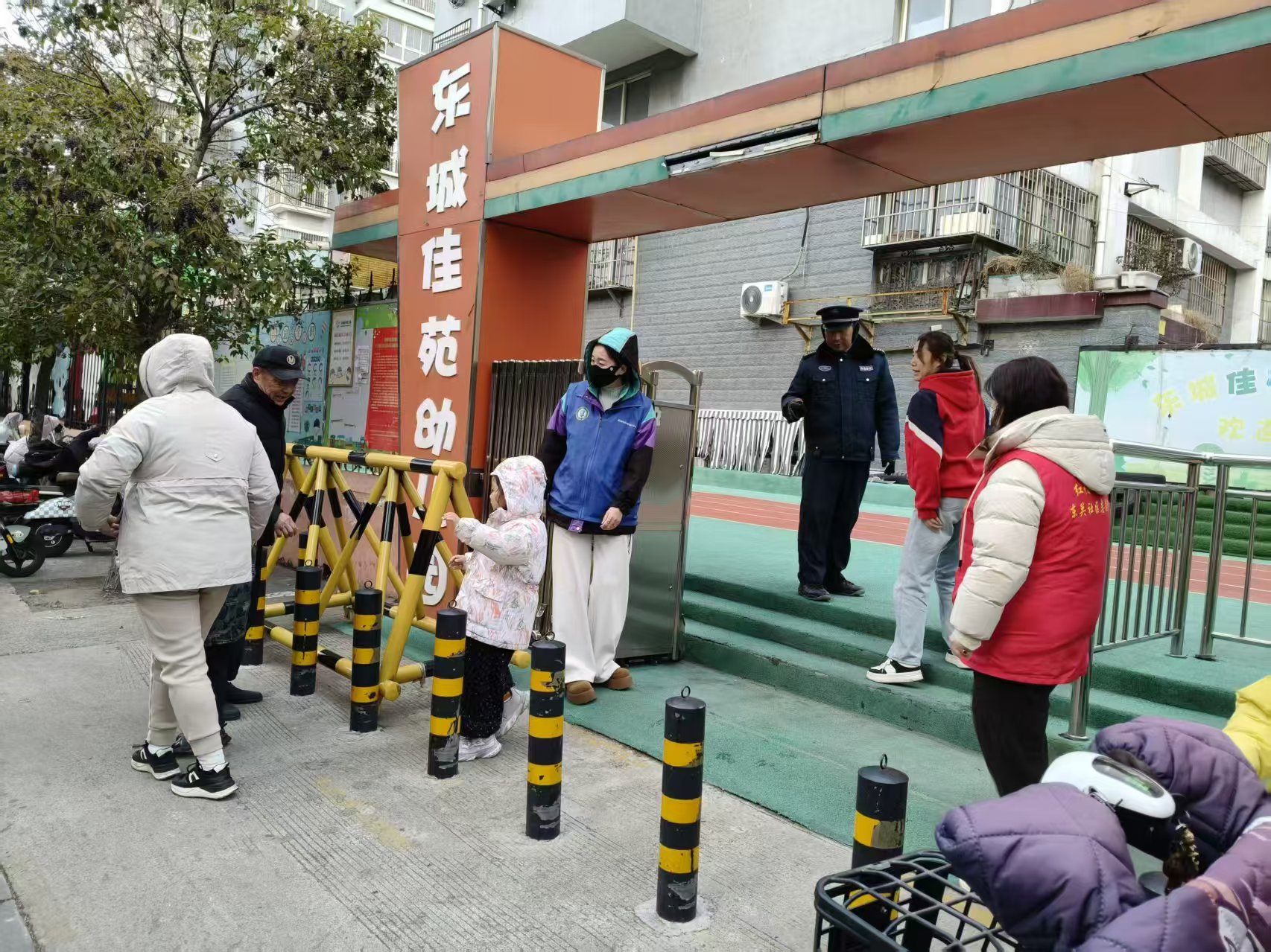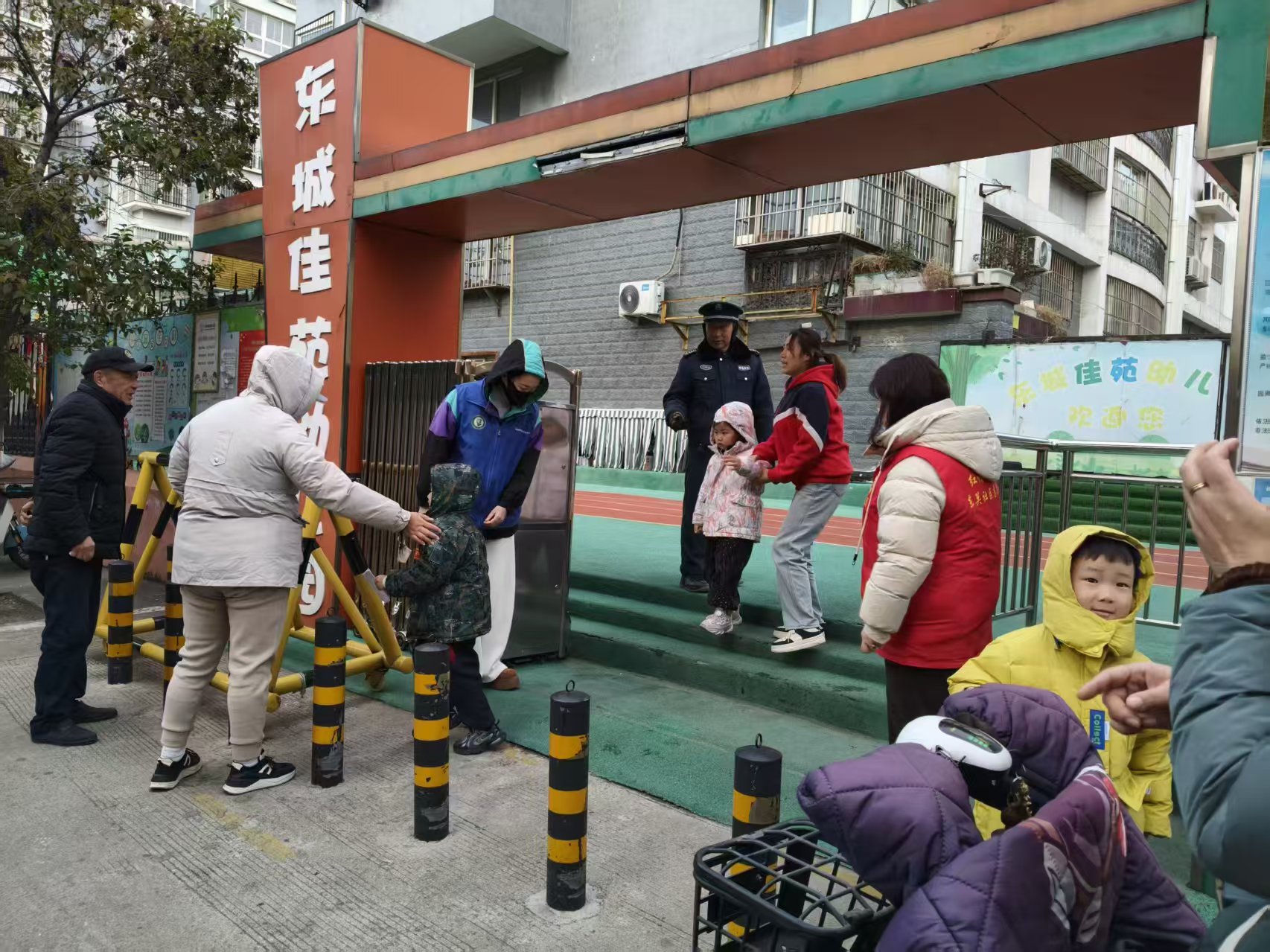 酒仙桥街道东关社区在辖区内幼儿园组织放学护学活动,缓解家长接送压力,维护校园周边秩序,保障幼儿安全离园。